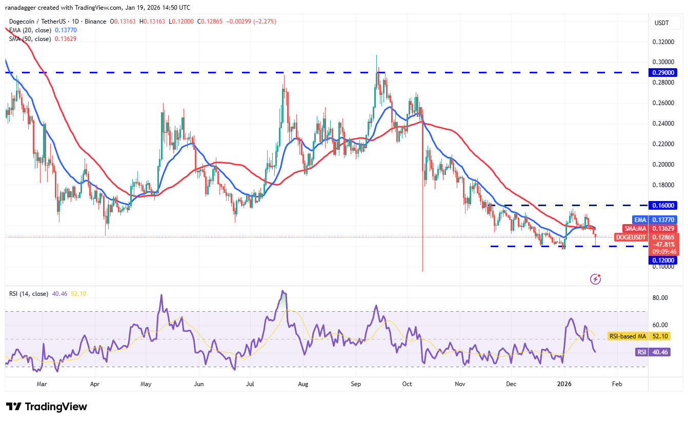 Dogecoin (DOGE) fell below the moving averages on Sunday and reached the $0.12 support on Monday.