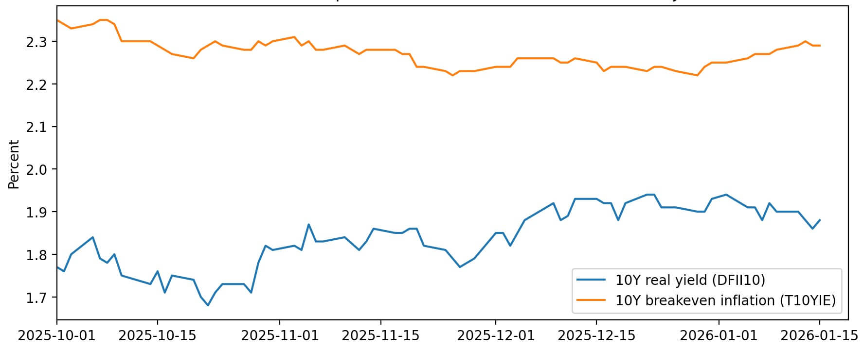 Ten-year real yields climbed from 1.7% in mid-October to 1.88% by mid-January, while breakeven inflation held relatively steady around 2.3%.