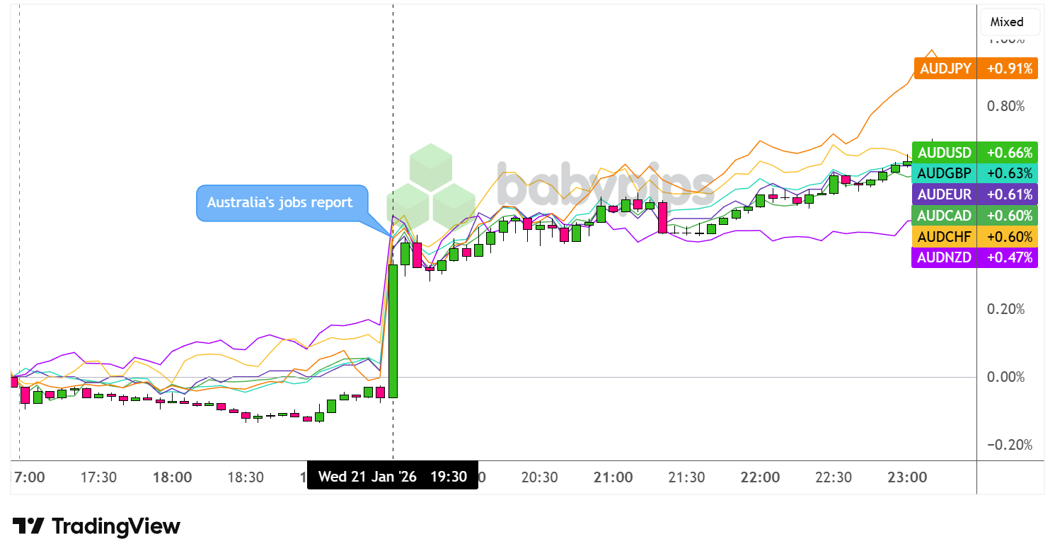 The Australian dollar rallied broadly following the jobs release, with traders interpreting the data as evidence of continued labor market resilience.