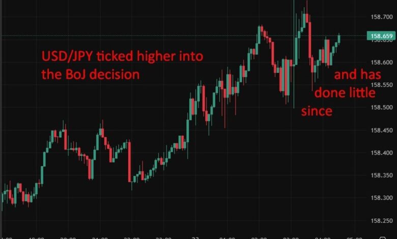 USD/JPY edged modestly higher through the session ahead of the BOJ announcement, with limited conviction. The central bank ultimately kept its policy rate at 0.75%, but the decision was split, with one board member voting for an immediate hike to 1.0%. The BOJ revised up several inflation projections and improved its growth outlook, underscoring a growing internal debate over the pace of normalisation. USD/JPY saw only limited post-decision volatility, with focus now shifting to Governor Ueda’s press conference (0630 GMT/0130 US Eastern time).