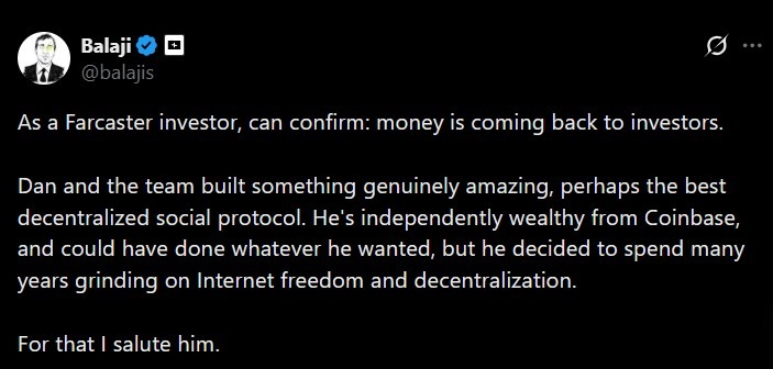 The post drew a response from Farcaster investor Balaji Srinivasan, who confirmed that investor funds are being returned. He also praised the team’s work on decentralized social infrastructure.