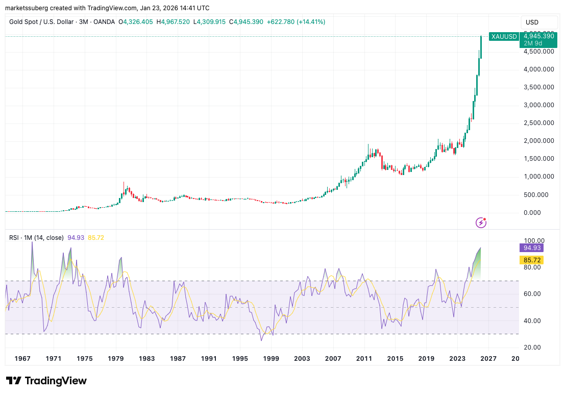 While gold’s monthly relative strength index (RSI) values hit their most “overbought” since the 1970s, bullish price forecasts continued to flow.