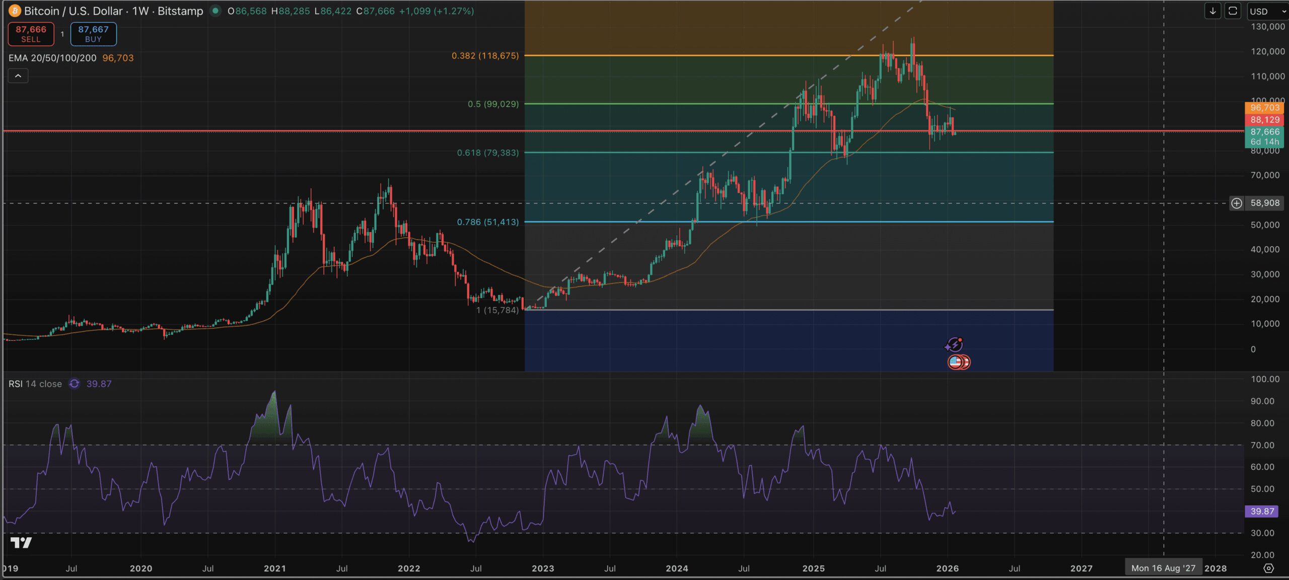 - BTC faces stiff resistance after a weekly close below $88,000 and a rejection at the 50-week exponential moving average of $96,700