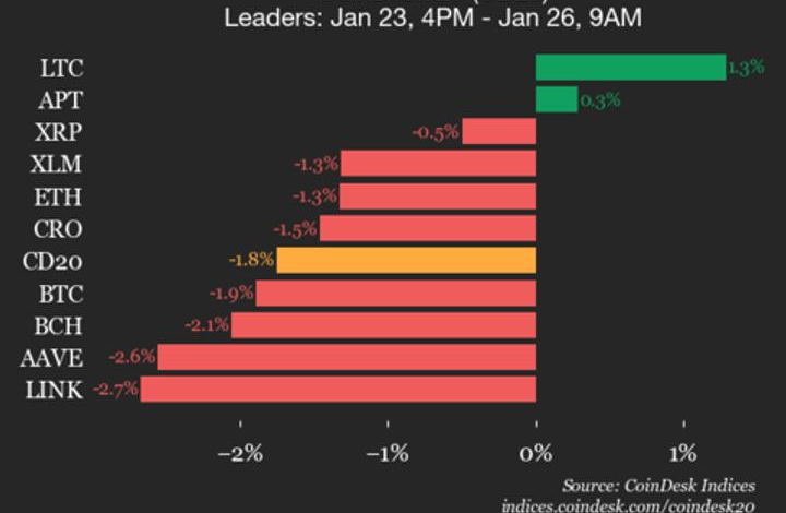 CoinDesk Indices presents its daily market update, highlighting the performance of leaders and laggards in the CoinDesk 20 Index.