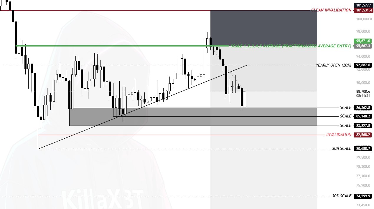 “I believe the maximum extension is likely around 89–91K before further downside,” trader Killa wrote in his latest post on X.