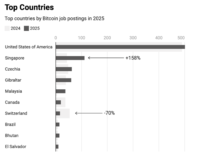 The US dominated Bitcoin job openings with around 500 listings, while Singapore was the biggest mover, surging into second-place with a 158% year-on-year increase in job openings.