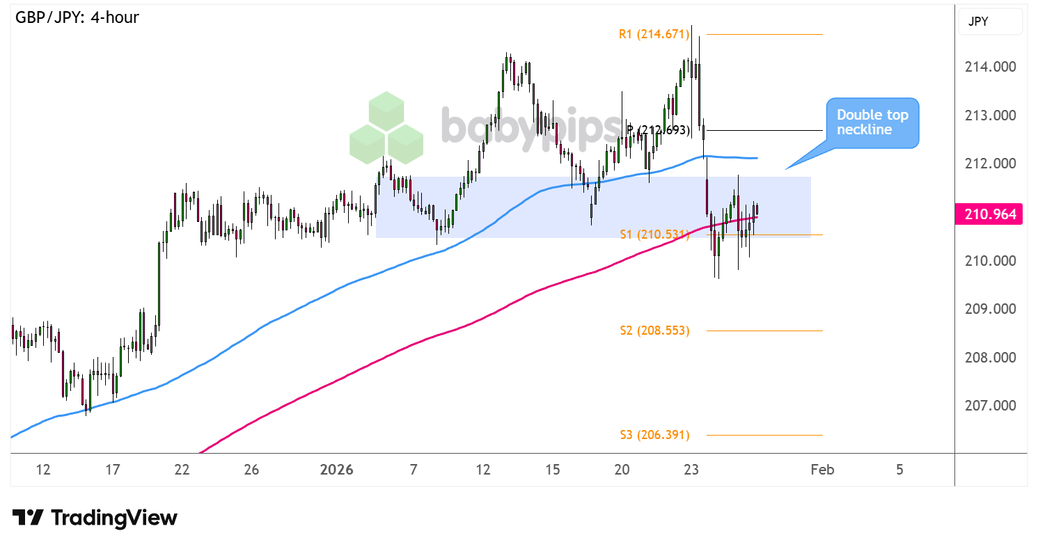 On the other hand, reversal candlesticks suggesting a bounce off current levels could still take the pair up to nearby resistance zones at the pivot point (212.69) or all the way up to the highs at R1 (214.67).