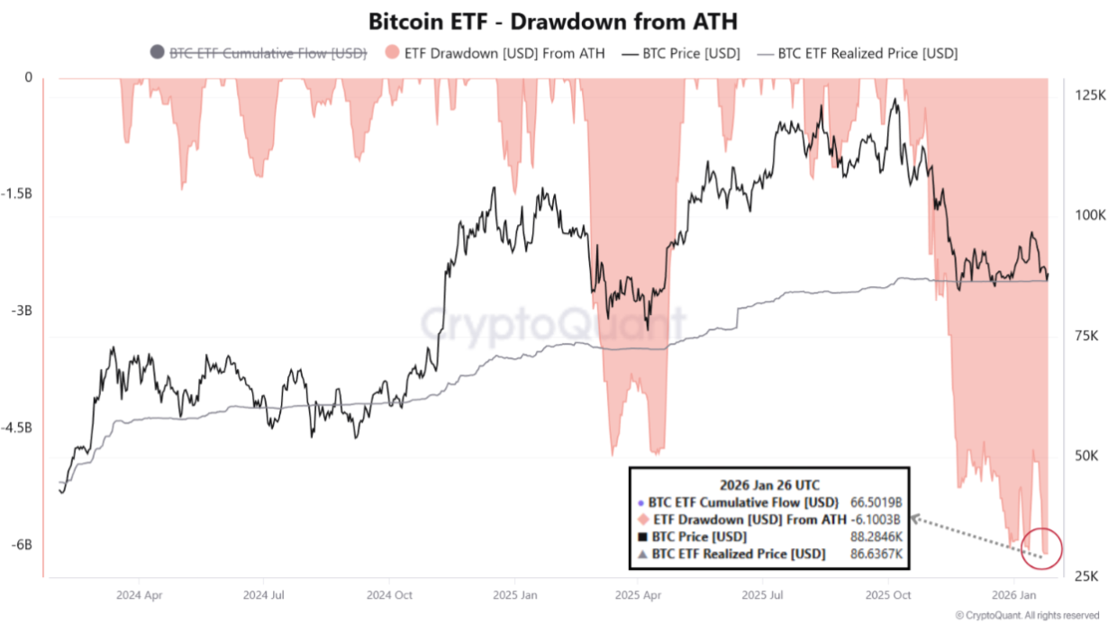 The US spot Bitcoin ETFs have seen outflows pass $6 billion since net holdings hit all-time highs of $72.6 billion in October 2025.