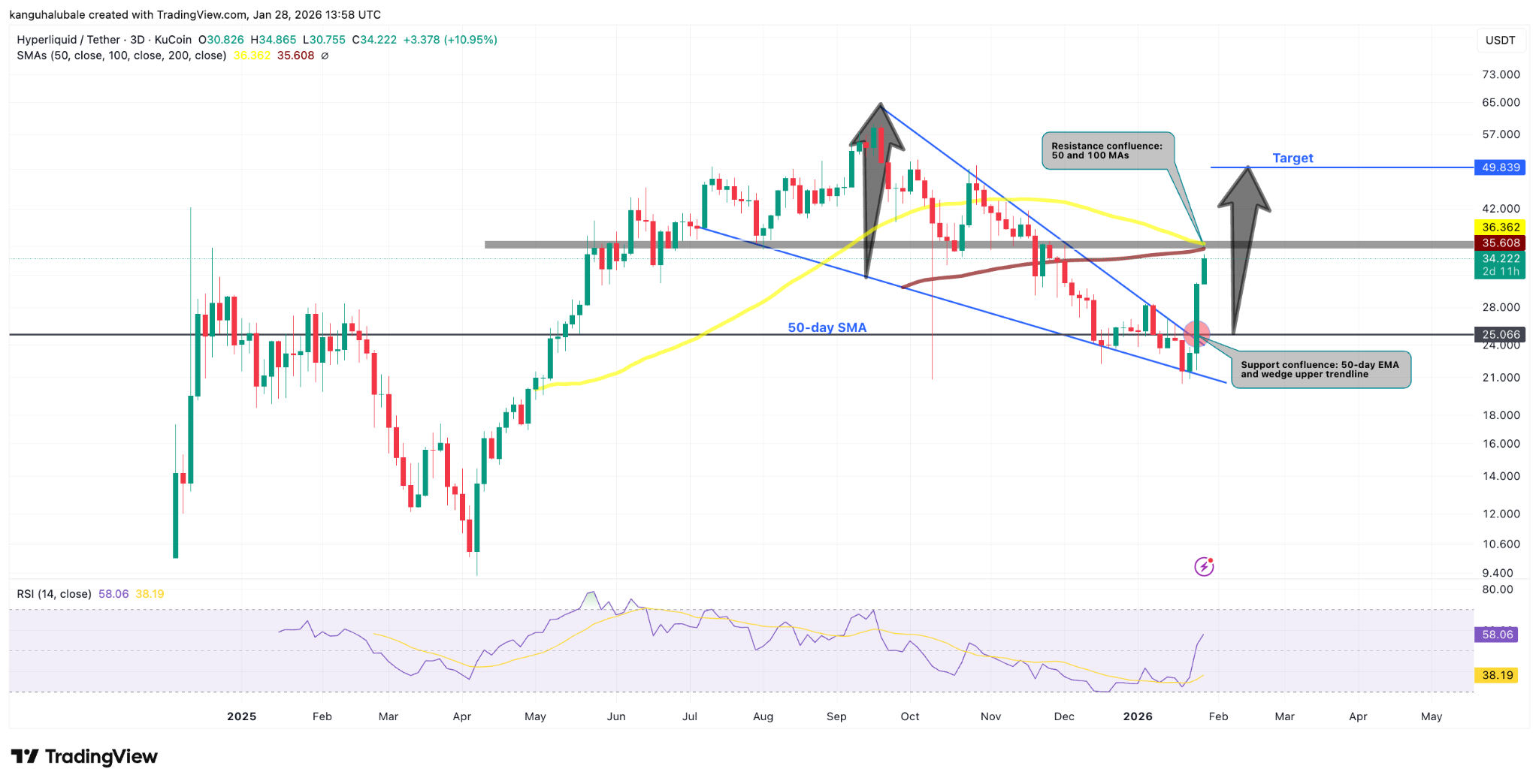 HYPE may rally toward its wedge upside target of about $49.8, representing a 45% increase from current price levels.