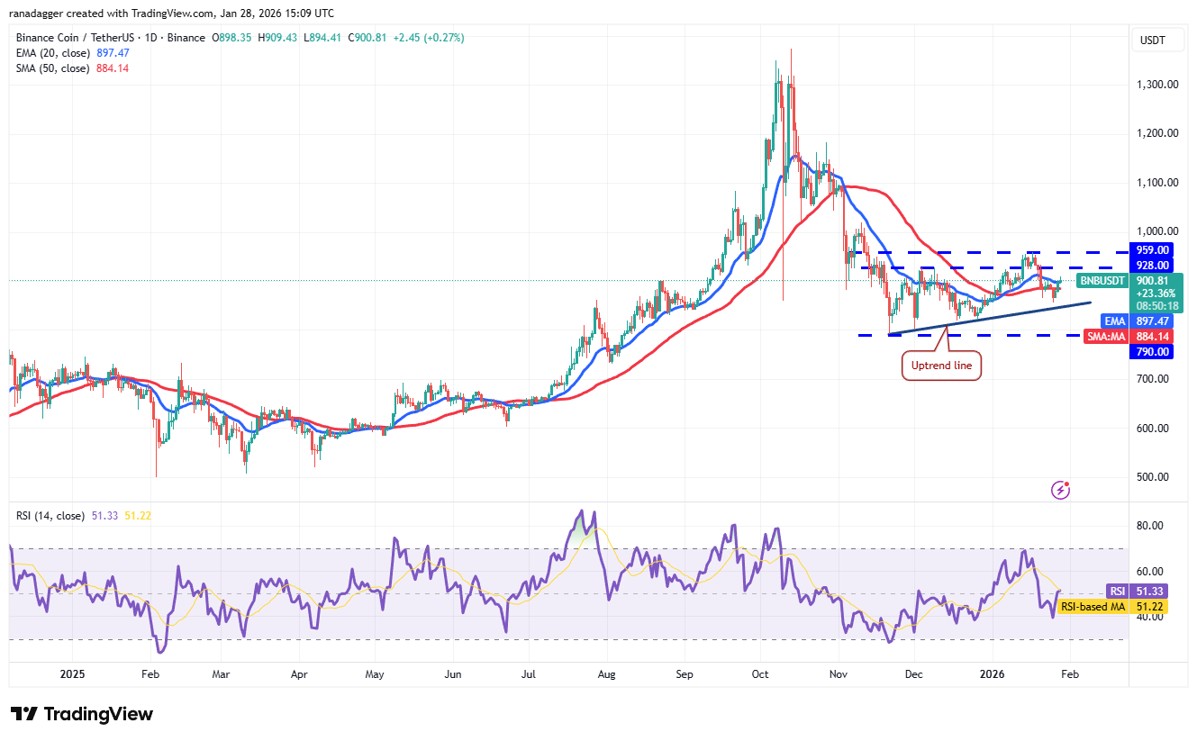 BNB (BNB) is attempting to rise above the 20-day exponential moving average ($897), indicating demand at lower levels.
