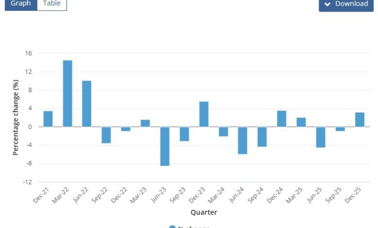 Export prices rose 3.2% quarter-on-quarter in Q4, reversing a 0.9% fall in Q3, as commodity prices stabilised and demand conditions improved late in the year. At the same time, import prices increased 0.9% q/q, well above expectations for a 0.2% decline and marking a clear turnaround from the previous quarter’s 0.4% fall.