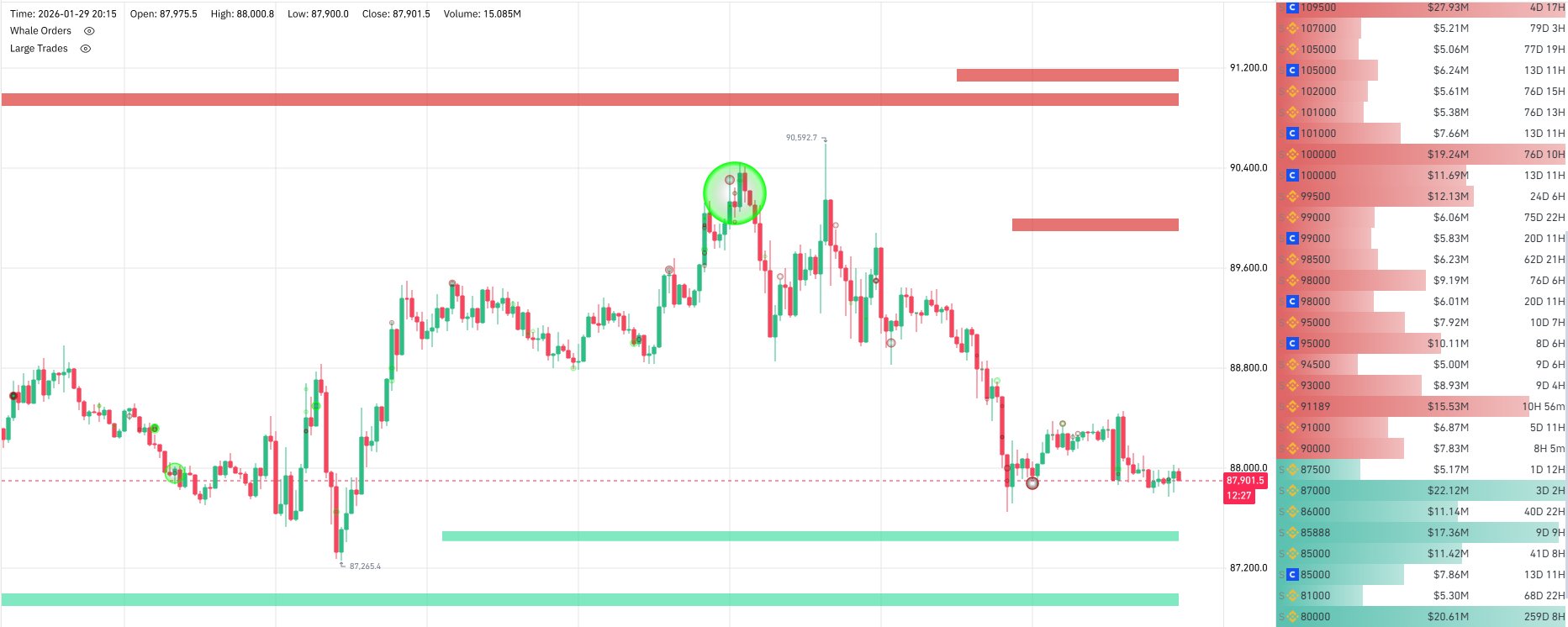 BTC/USDT order-book liquidity data with whale orders. Source: Keith Alan/X