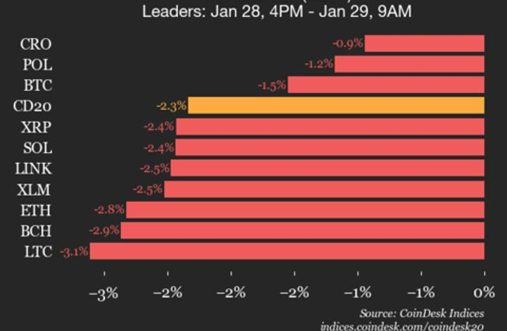 CoinDesk 20 performance update: index drops 2.3% as all constituents trade lower