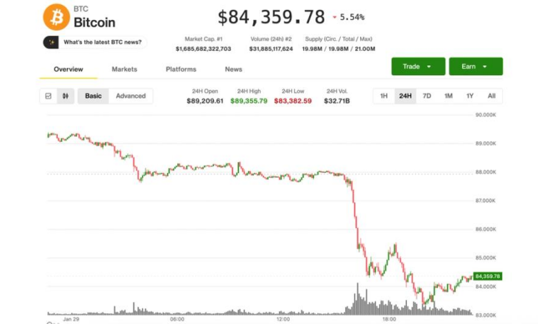 Modest overnight declines in crypto turned into a major rout in the U.S. morning as the Nasdaq shed more than 2% and gold tumbled nearly 10% from an overnight record. But while both of those markets managed sizable afternoon bounces — the Nasdaq closing with a decline of just 0.7% and gold reclaiming the $5,400 per ounce level — bitcoin and the rest of crypto held not far from session lows. Bitcoin was trading just above $84,000 at press time. Losing almost 6% over the past 24 hours, bitcoin is on the brink of breaking below its two-month range, which could be a prelude to an even deeper pullback.