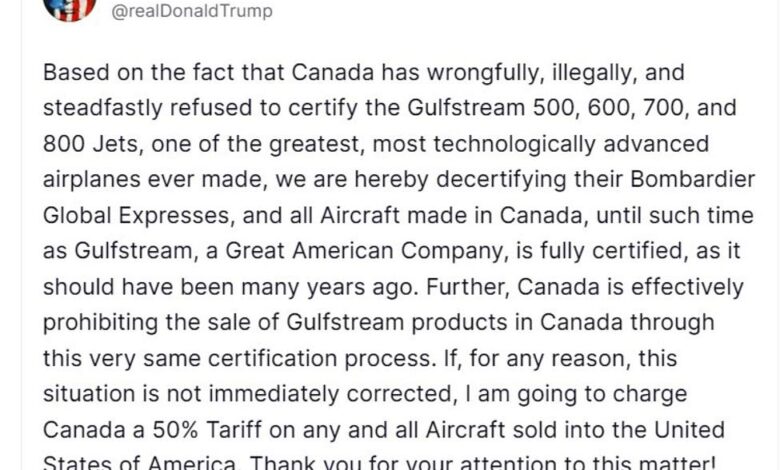 In response, Trump said the US would move to decertify Canadian-made aircraft, including Bombardier Global Express jets, until Gulfstream models are fully certified in Canada. He also warned that if the situation is not “immediately corrected,” the US would impose a 50% tariff on all aircraft sold into the United States from Canada.
