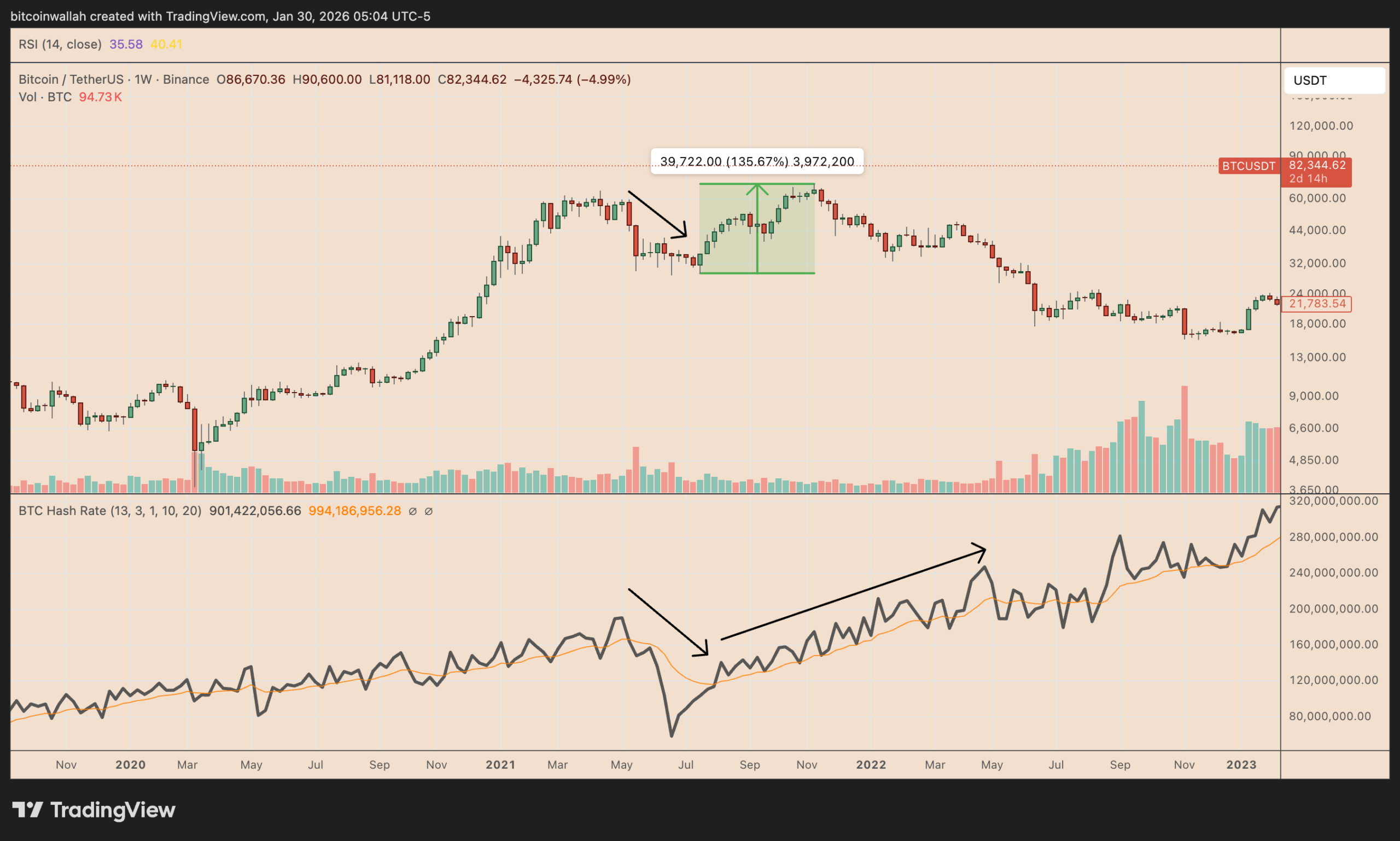 After China’s 2021 mining ban, for example, the hash rate fell about 50%, and BTC slid from around $64,000 to $29,000. But the price recovered to $69,000 within five months.