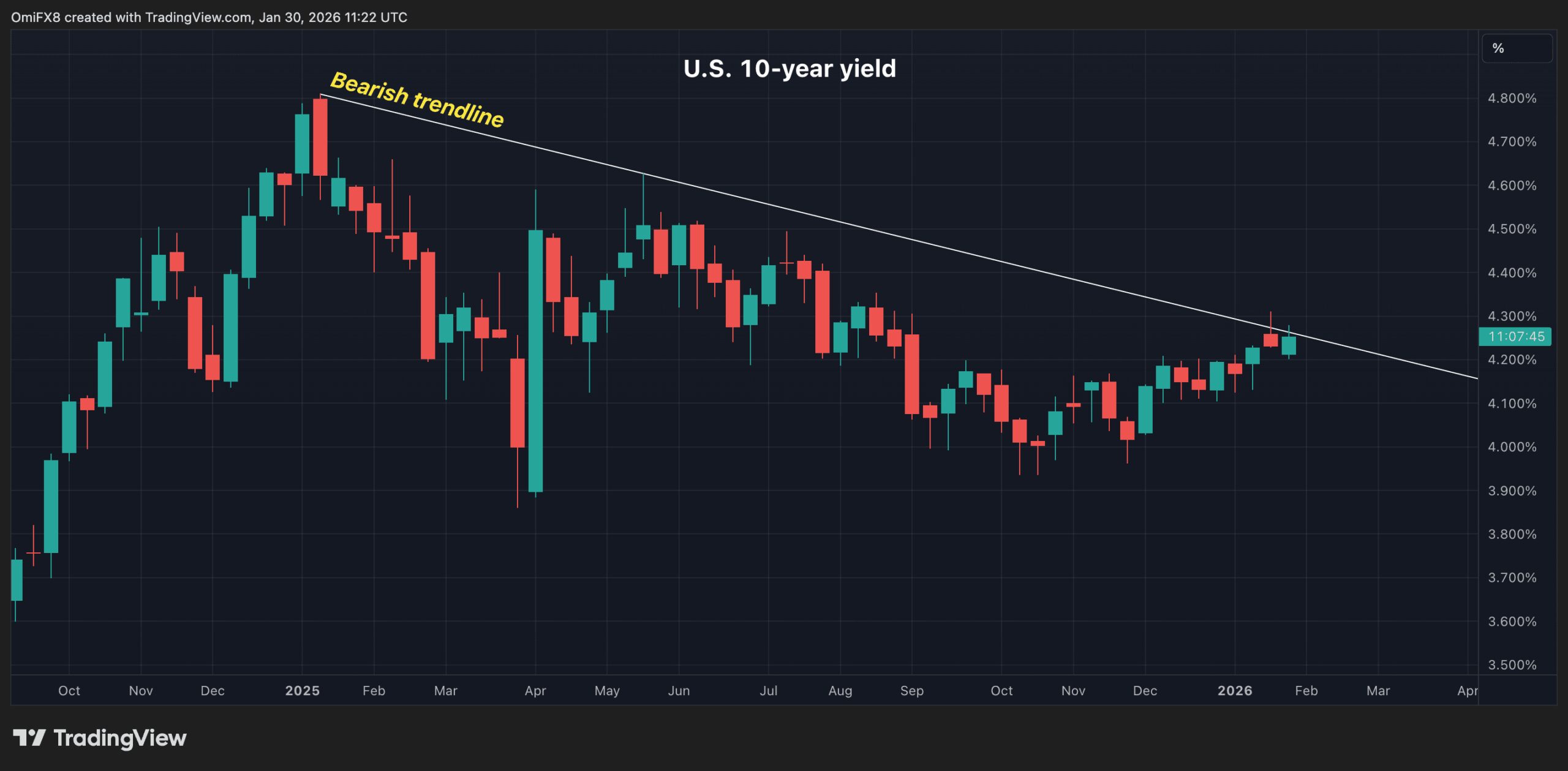 • The chart shows weekly swings in the 10-year U.S. Treasury yield since late 2024.