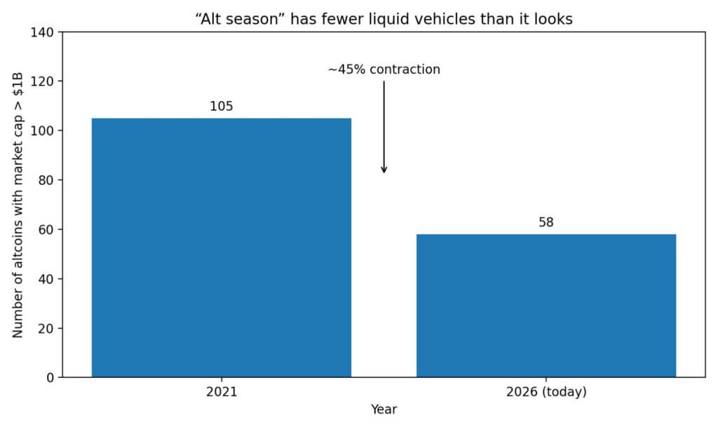 The investable universe itself has shrunk. Coin Metrics tracks that altcoins with market caps above $1 billion fell from roughly 105 at the 2021 peak to just 58.