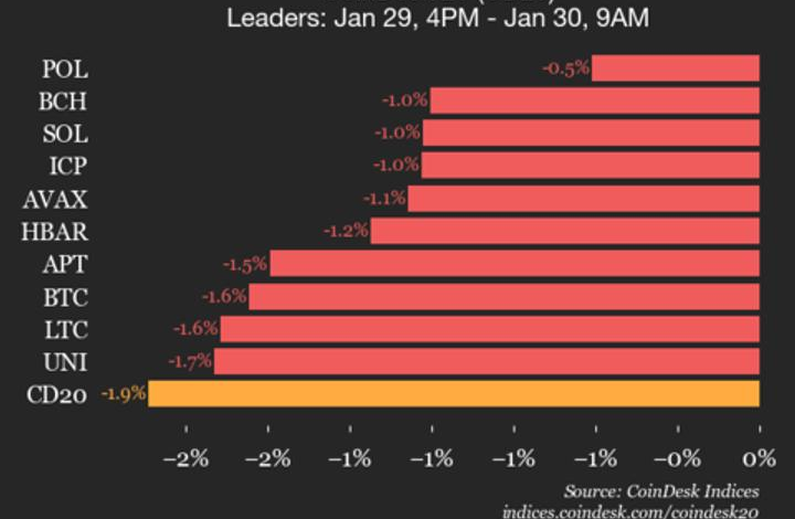 CoinDesk 20 performance update: index slides 1.9% as all assets trade lower