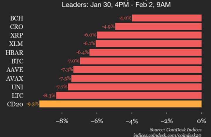 CoinDesk Indices presents its daily market update, highlighting the performance of leaders and laggards in the CoinDesk 20 Index.