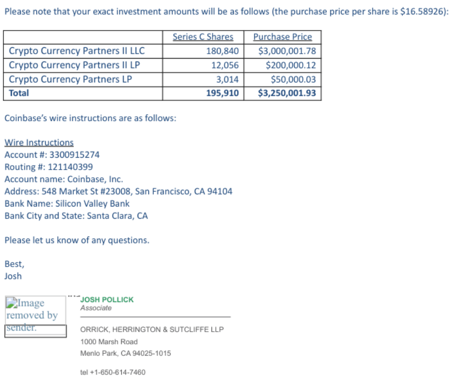 The emails suggest an entity linked to Epstein acquired 195,910 Series C shares for a total of $3.25 million when Coinbase was valued at $400 million.