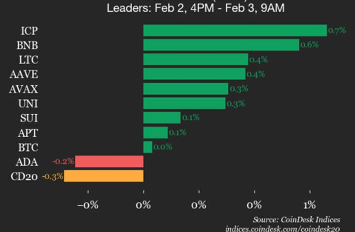 Leaders: ICP (+0.7%) and BNB (+0.6%).