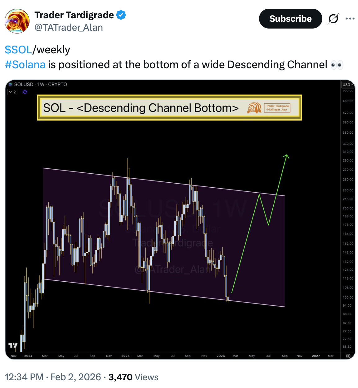 Trader Tardigrade said that SOL’s rebound from the lower boundary of the descending channel could see it rise toward the upper boundary around $215.