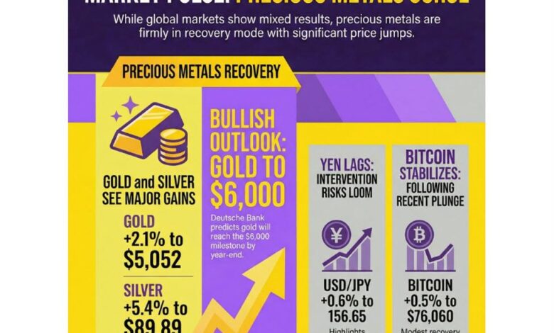 The market focus stayed on precious metals with gold and silver continuing to recover from the sharp pullback last week. Gold is moving back above the $5,000 mark and is starting to establish a more bullish near-term bias again on the day. Meanwhile, silver is flirting with a push back above the $90 mark as both precious metals are keeping up with the bounce from the past few sessions.