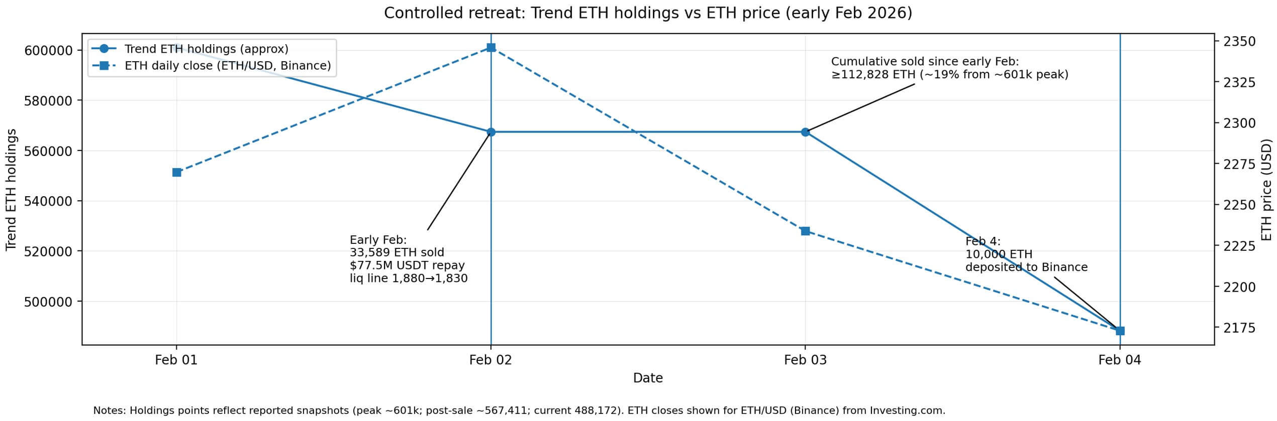 Chart shows Trend Research reducing Ethereum holdings from 601,000 to 488,172 ETH through early February 2026 as ETH price declined from $2,350 to $2,175.