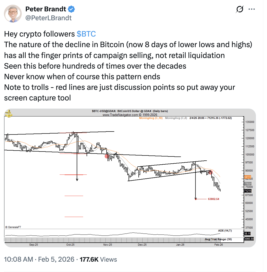 Brandt says “campaign selling” is pressuring BTC, with miners and ETFs also cutting exposure.