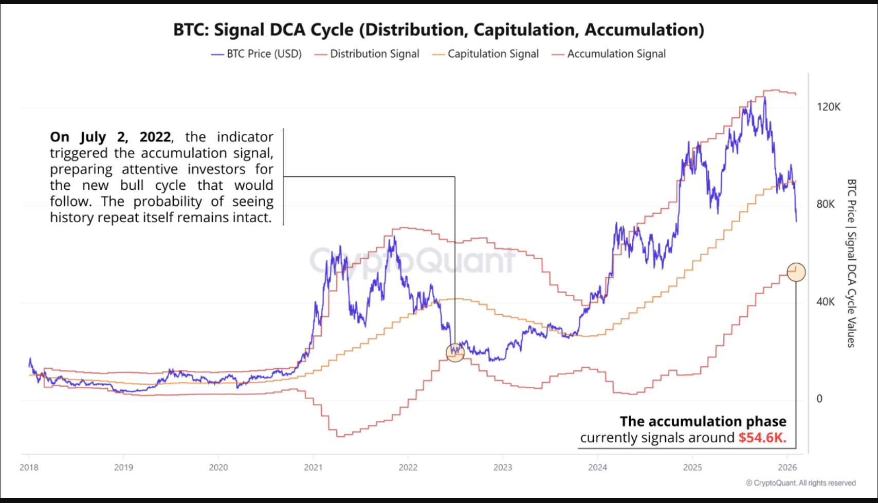 “The current price convergence toward the band signaling the start of the accumulation phase, situated around $54.6K, suggests we are in the critical transition between Capitulation and Accumulation.”