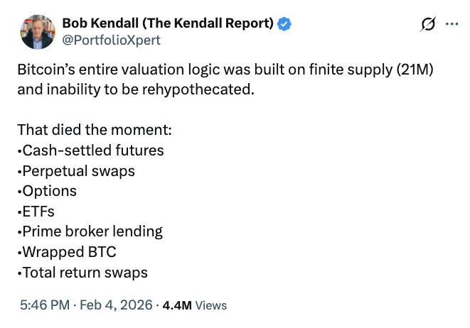 “The same 1 BTC can now support an ETF unit, a future contract, a perpetual swap, an options delta, a broker loan, a structured note. All at once,” Bob Kendall, technical analyst and author of The Kendall Report, said in a Wednesday X post.