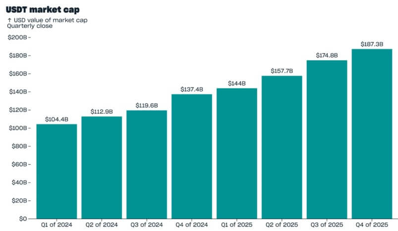 The rapid increase was further corroborated by Tether, which reported that USDT ended the fourth quarter of 2025 with a market capitalization of $187.3 billion, an increase of $12.4 billion from the prior quarter.