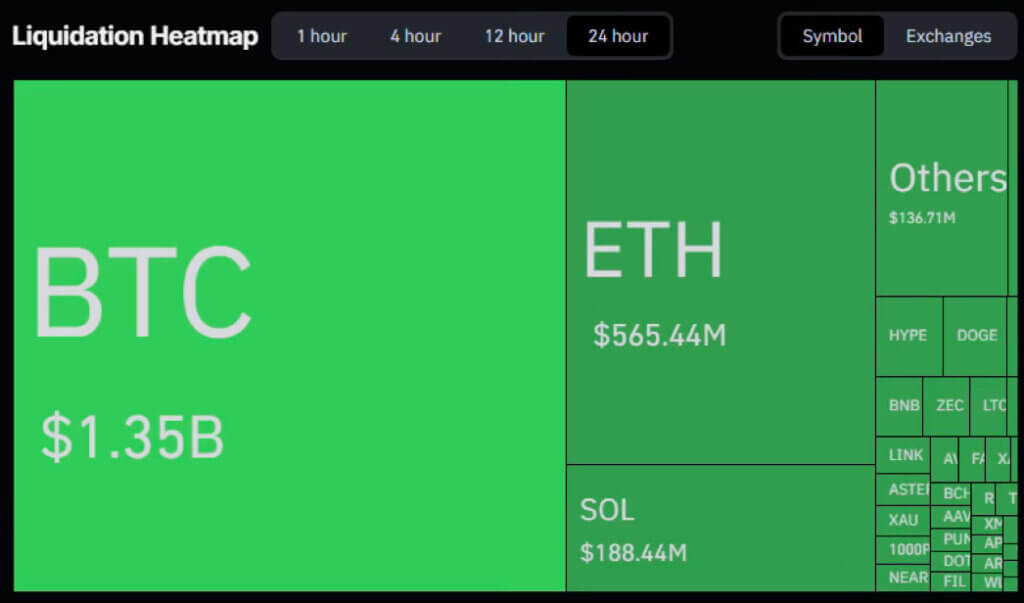 - Total crypto market liquidations hit $2.60 billion in 24 hours with longs accounting for $2.13 billion