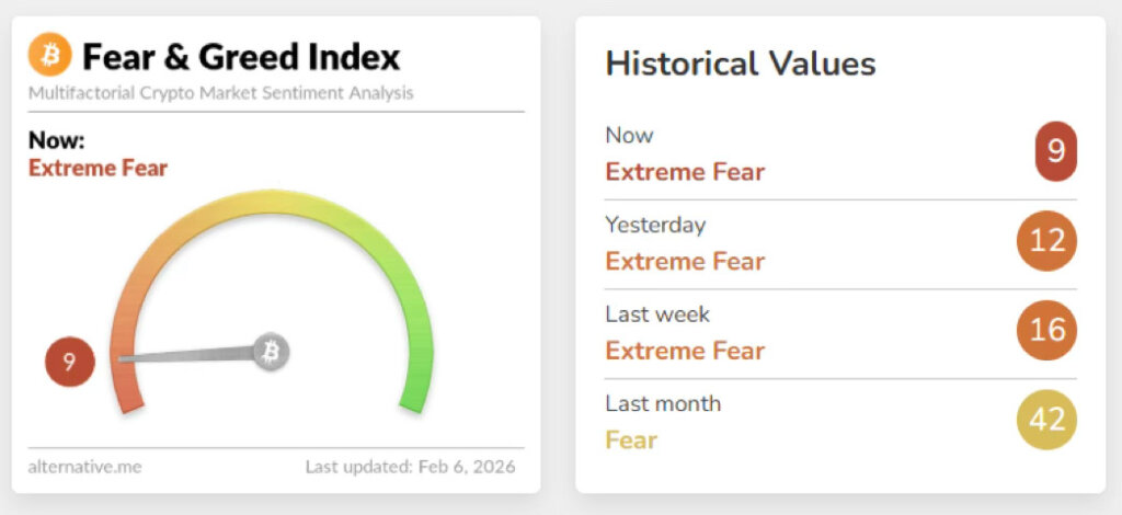 - Fear & Greed Index fell to 9 on Feb. 6, classified as extreme fear, down from 16 one week earlier