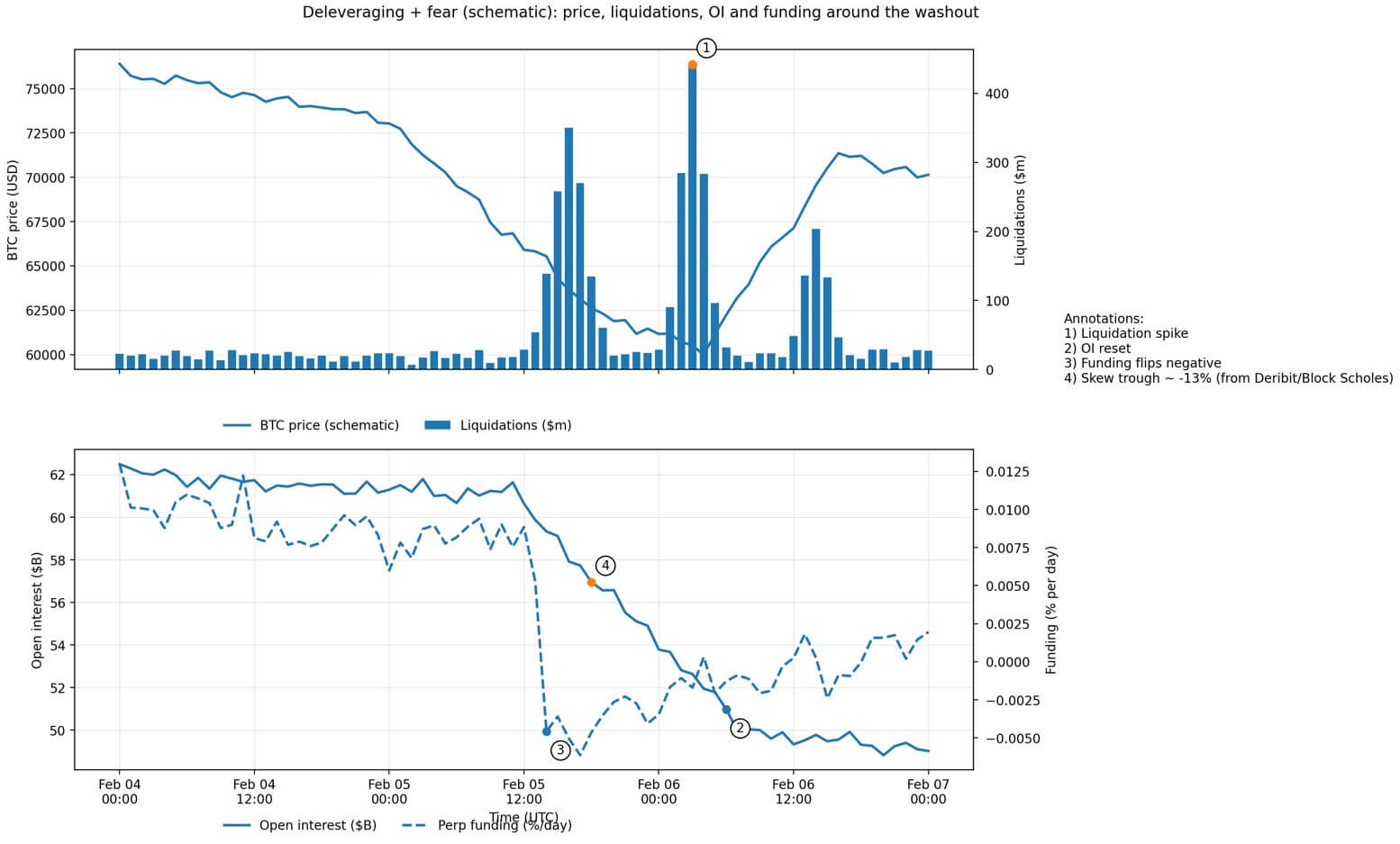 | Leverage | Futures open interest (OI) | Deleveraging / OI falling (forced liquidation phase); recent reporting highlights ~$55B equivalent OI exiting in 30 days | OI stabilizes (no rapid re-leveraging) while price holds >$70K | OI rebuilds quickly into rallies → higher odds of another liquidation leg | Glassnode: forced deleveraging + long liquidation spikes |