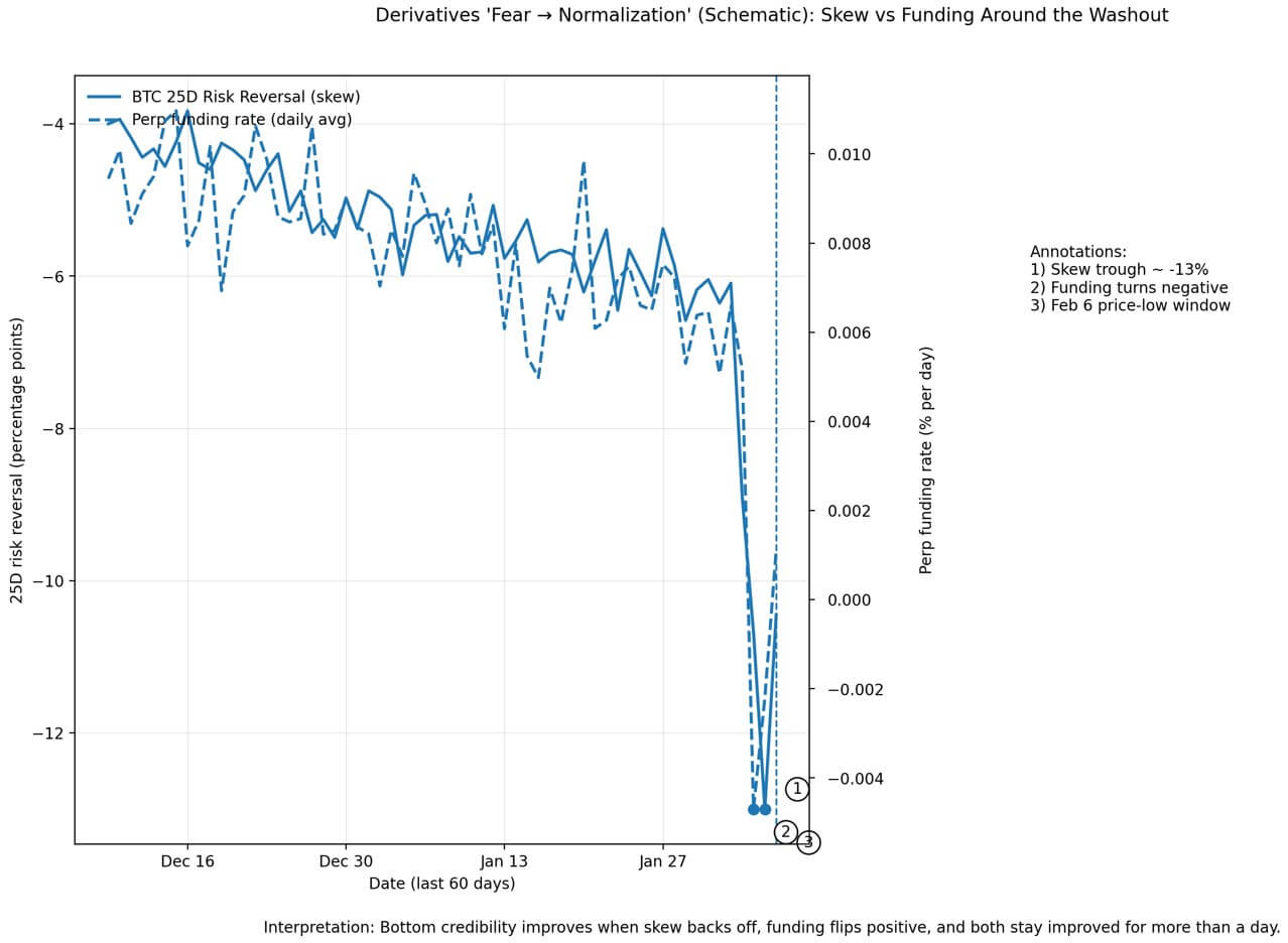 | Derivatives | 25D risk reversal (skew) | Short-dated skew as low as ~-13% (puts bid / downside protection in demand) | Skew lifts toward 0 (less demand for downside hedges) and stays there for multiple sessions | Skew stays deeply negative (continued demand for protection) | Deribit Insights / Block Scholes “Crypto Derivatives: Analytics Report – Week 6” (Feb 4, 2026). (Deribit Insights) |