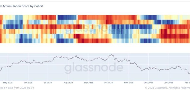Glassnode’s Accumulation Trend Score by cohort highlights this shift in behavior. The metric measures the relative strength of accumulation across different wallet sizes by factoring in both entity size and the amount of BTC accumulated over the past 15 days. A score closer to 1 signals accumulation, while a score closer to 0 indicates distribution.