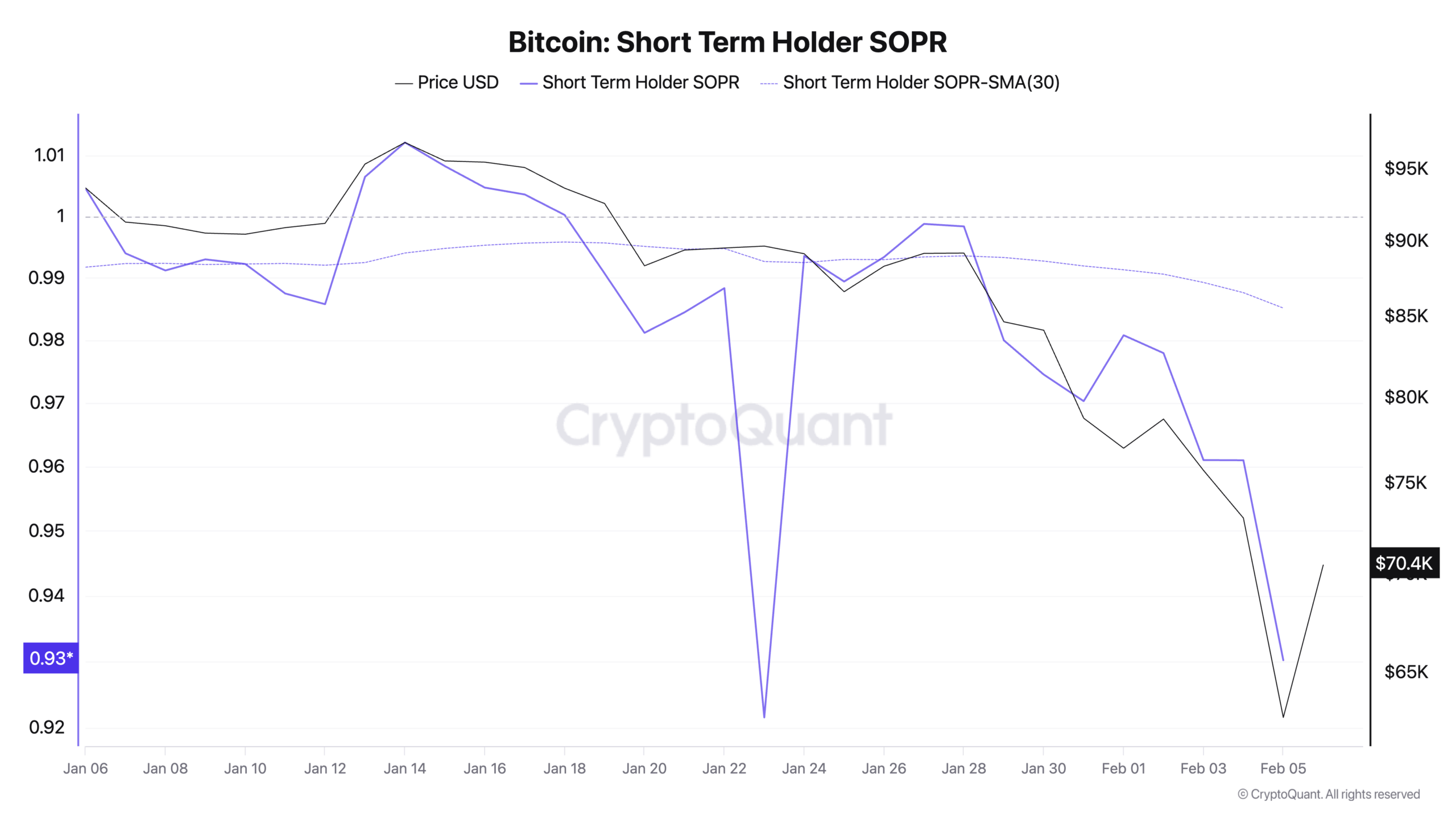 CryptoQuant data showed short-term holder SOPR fell to about 0.93 on Feb. 5. A reading below 1.0 implies recent buyers are realizing losses, and a dip into the low 0.9s often shows periods when weaker hands are getting shaken out.