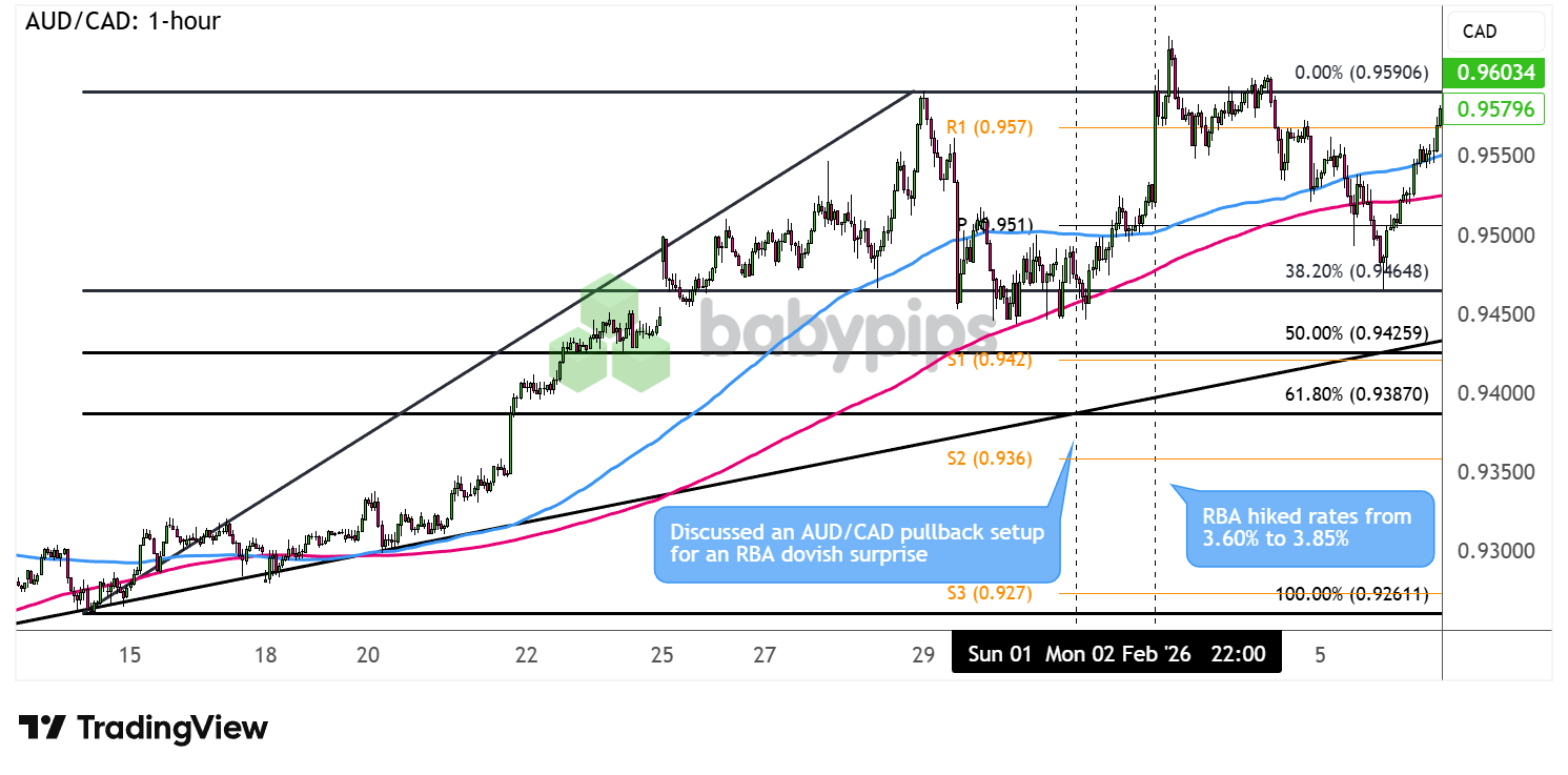 Our analysts flagged AUD/CAD’s uptrend from mid December and outlined a possible pullback toward deeper retracement zones, including the 50% Fibonacci level or even trend line support, in the event of a dovish RBA outcome.
