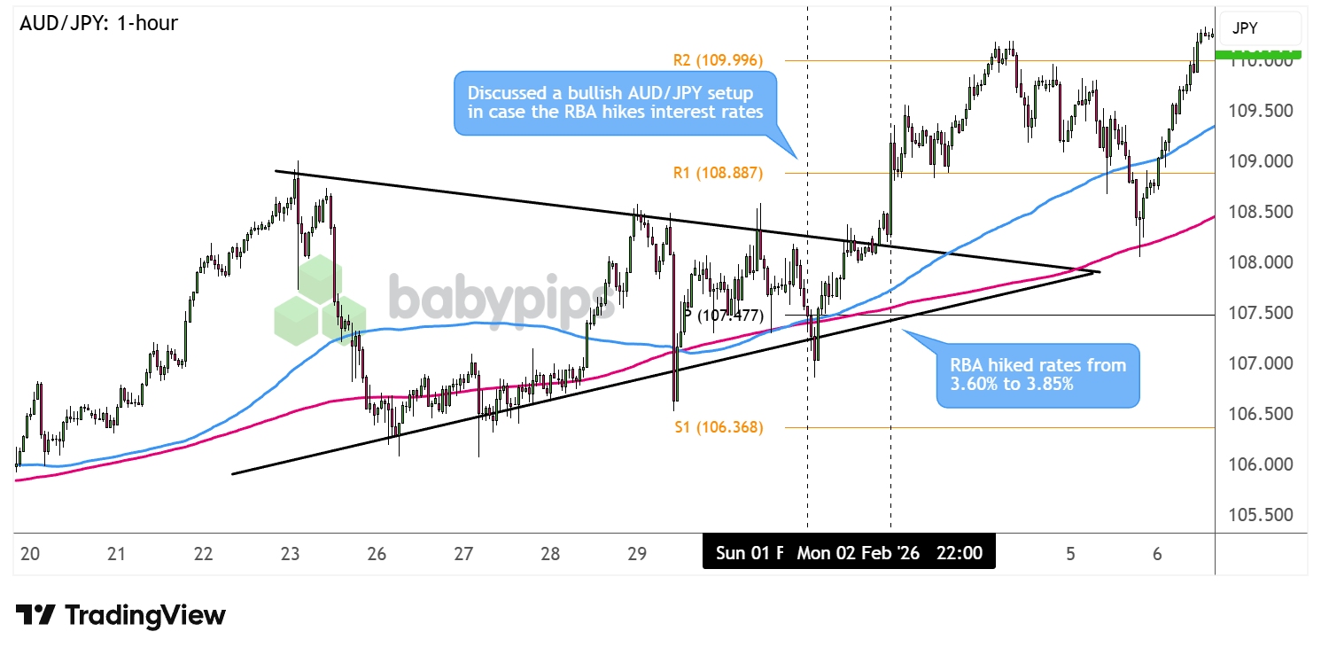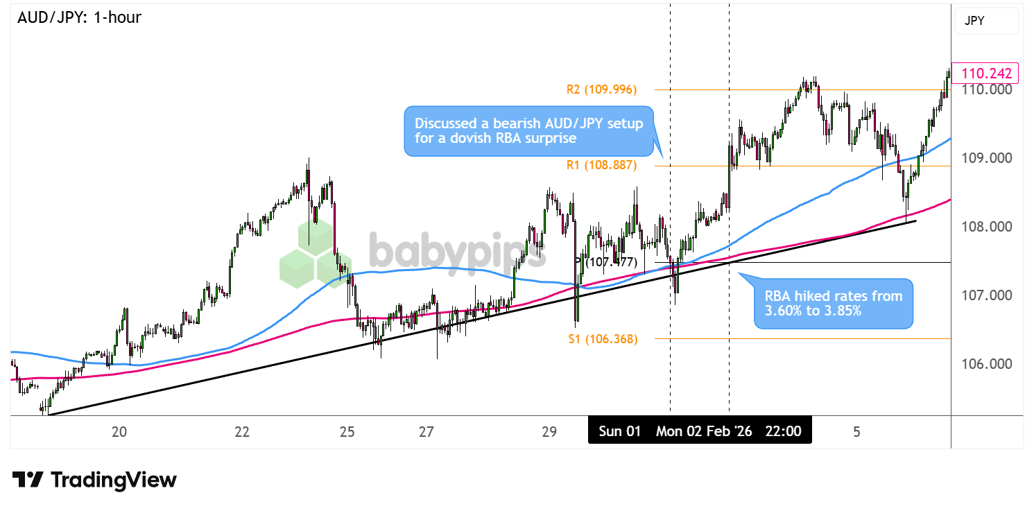 Instead, the RBA delivered a unanimous 25 bp hike with guidance pointing to further tightening, fully invalidating the bearish AUD case. Easing US-Iran tensions also supported risk sentiment through the Asian and early London sessions, removing the risk-averse backdrop that the setup depended on.