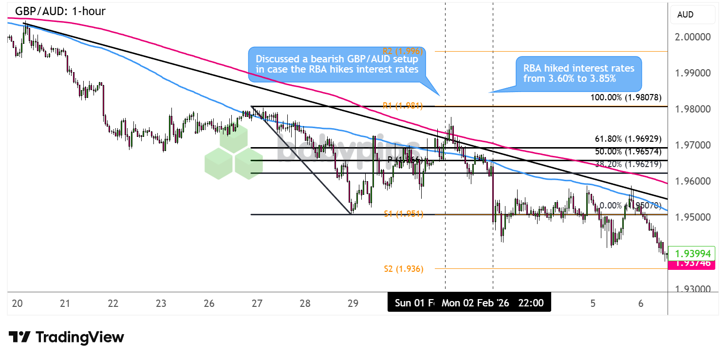 Our analysts flagged a potential bearish breakout for AUD/JPY if the RBA held rates and leaned dovish, particularly if risk-off conditions boosted demand for the safe-haven yen over the Aussie.