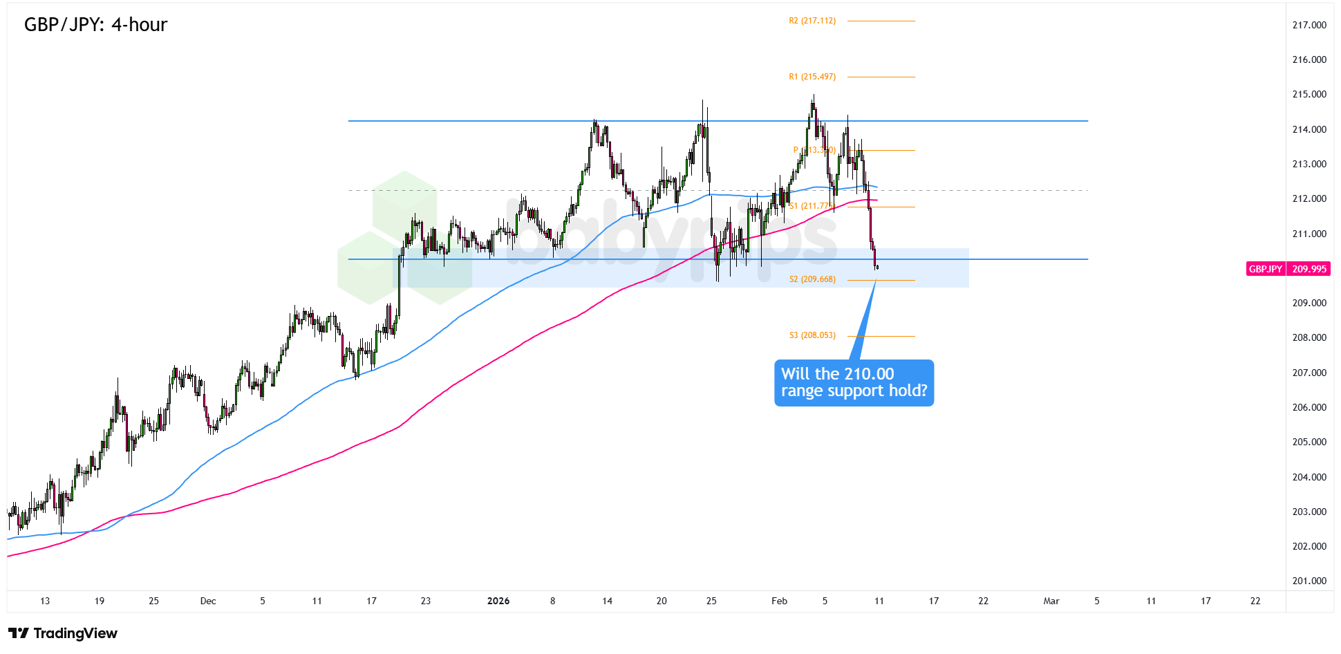 What makes today interesting is that the pair is now testing the 210.00 range support area, right around the S1 pivot point at 209.67.