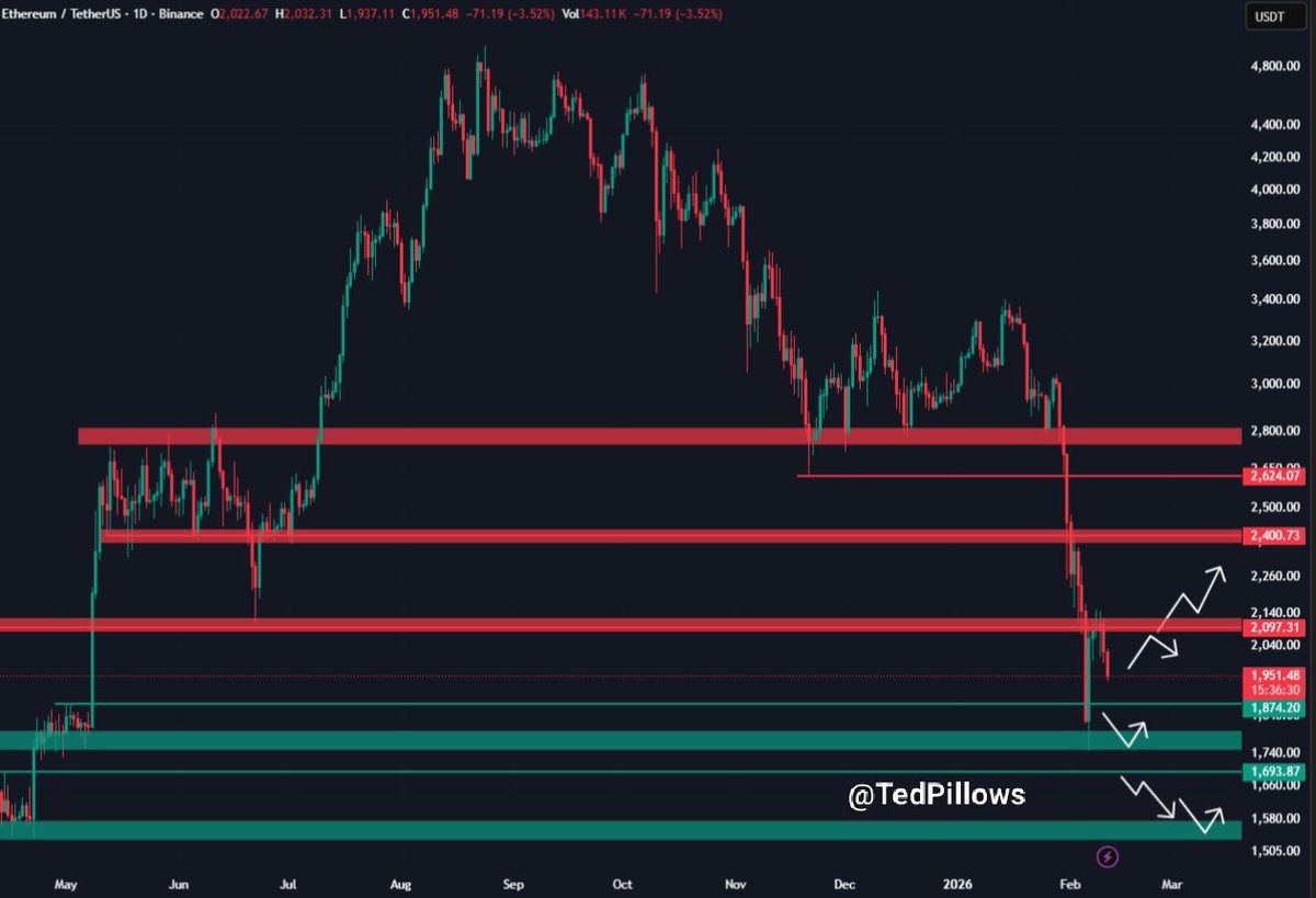 “$ETH failed to hold above the $2,000 level and is now going down,” crypto analyst Ted Pillows said in an X post on Wednesday, adding: