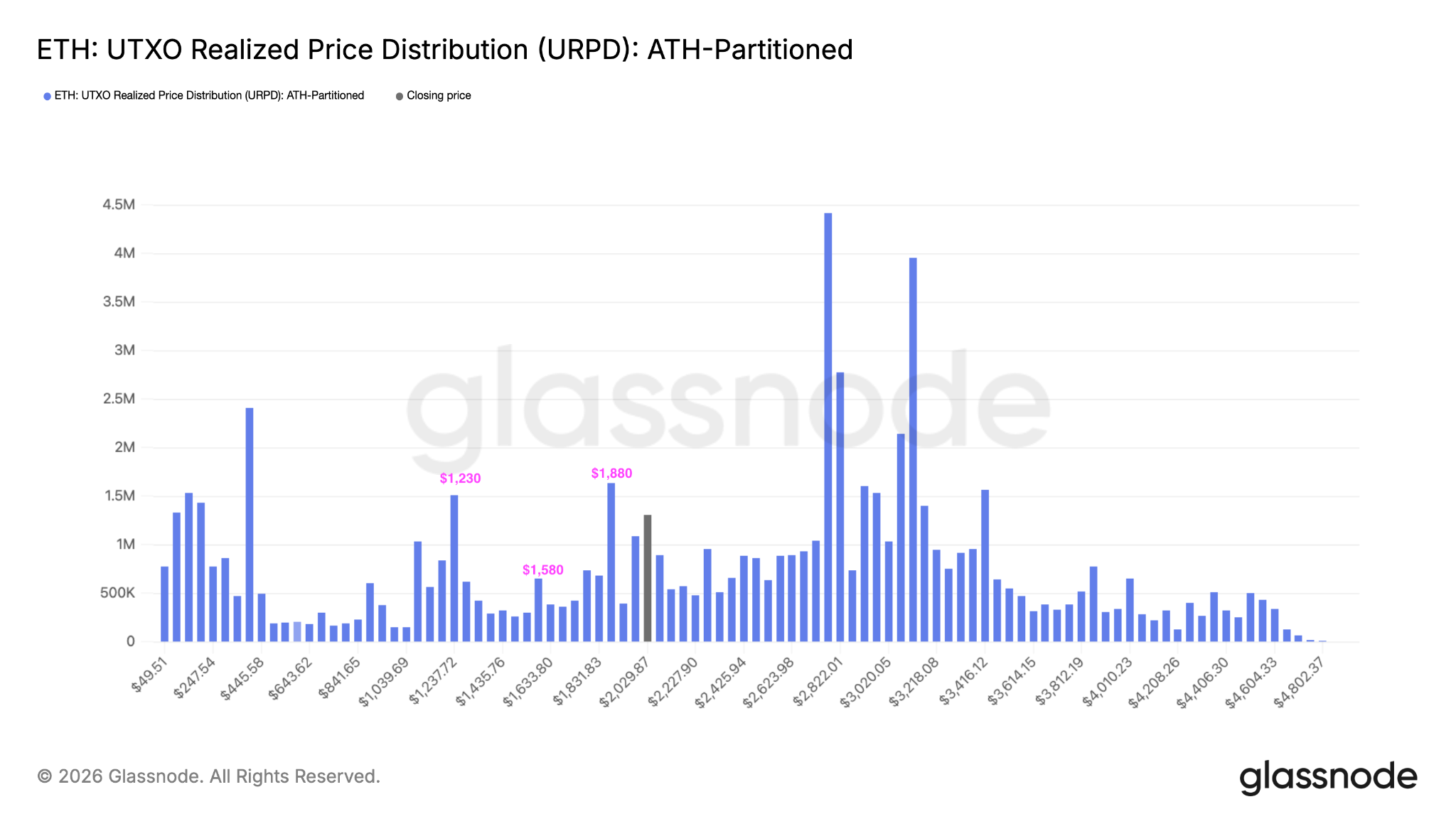 Glassnode’s UTXO realized price distribution (URPD), which shows the average prices at which ETH holders bought their coins, reveals that below $2,000, key support levels for ETH sit at $1,880, $1,580, and $1,230.