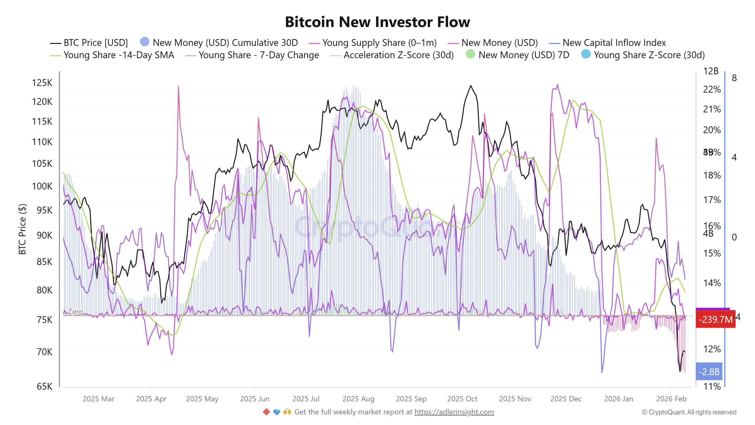 CryptoQuant data further reinforces the lack of spot demand below $70,000. The 30-day cumulative new money flow has turned negative, near -$2.8 billion, while recent daily readings remain subdued around -$239 million.