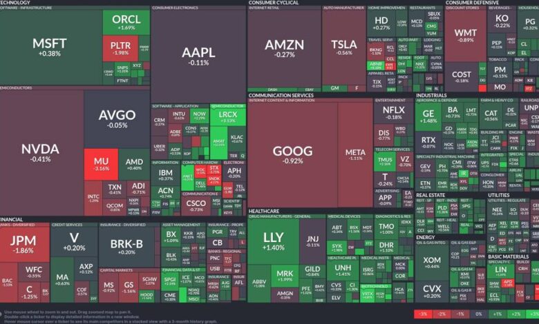 - 📉 Technology: Mixed emotions run through technology stocks, with Oracle (ORCL) experiencing a promising 1.69% rise, but Nvidia (NVDA) dwindling slightly by 0.41%. The semiconductor space struggles as Micron (MU) slips by 3.16%, revealing investor caution.