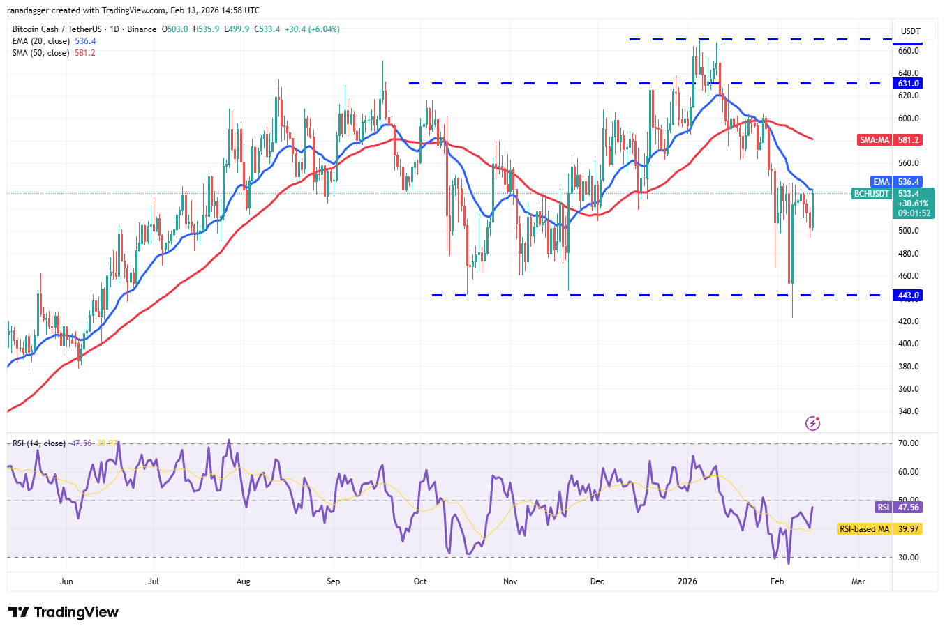 The bulls are attempting to push the price above the 20-day EMA ($536) but are expected to face significant resistance from the bears. If the price turns down from the 20-day EMA and breaks below $493, the BCH/USDT pair may plunge toward the $443 level.