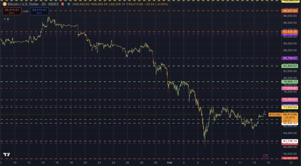 That matters because the last major reference point beneath it is the wick low near $60,000. That zone carries the kind of emotional weight that turns small pullbacks into big reactions. When price hovers in the high $60,000s and low $70,000s, the market starts asking whether another wick revisit is coming.
