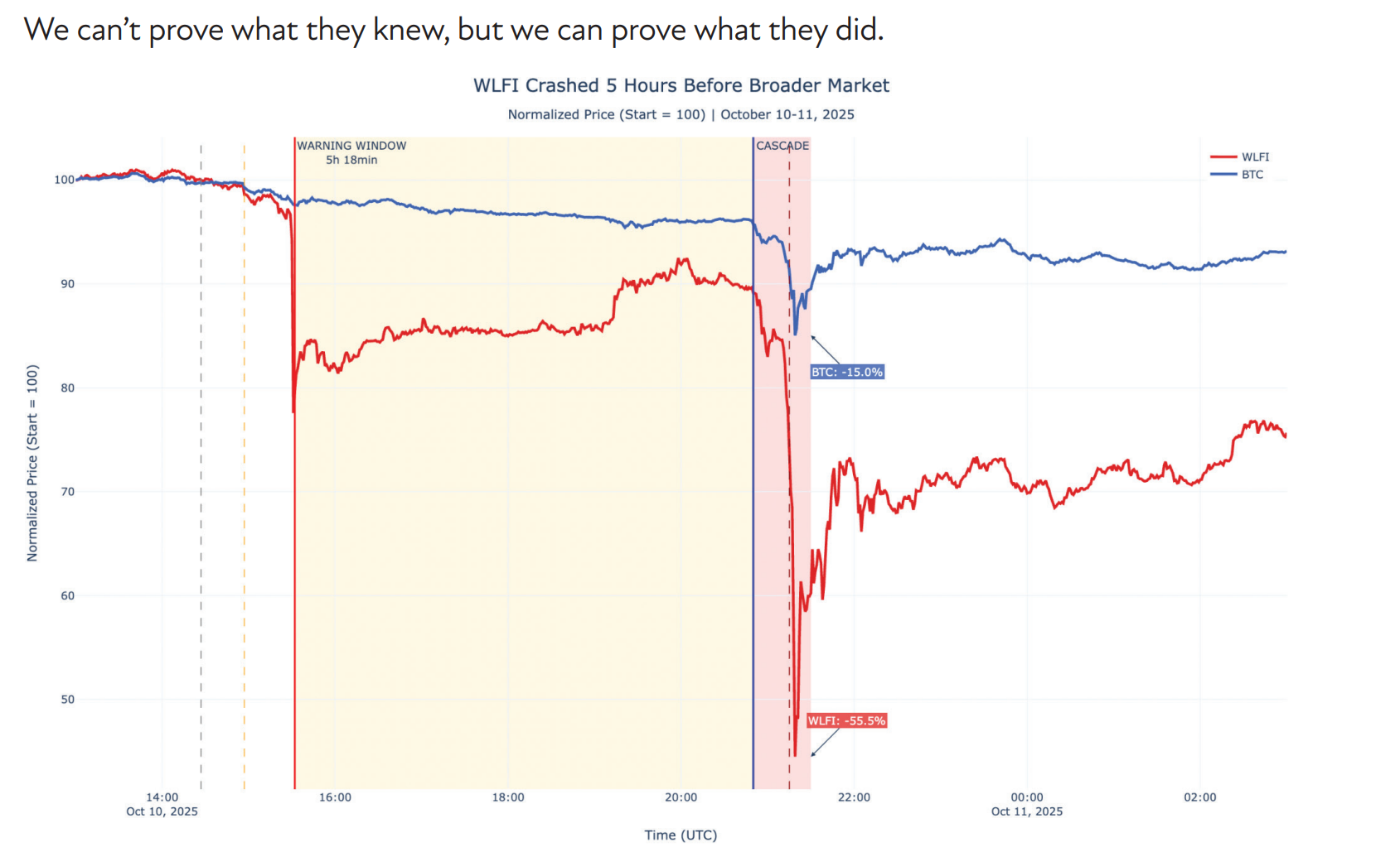 Researchers analyzed three unusual patterns, including a surge in trading activity, a sharp divergence from Bitcoin and extreme leverage, to determine whether WLFI signaled stress before the broader market selloff.